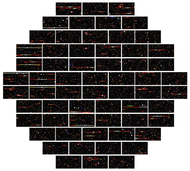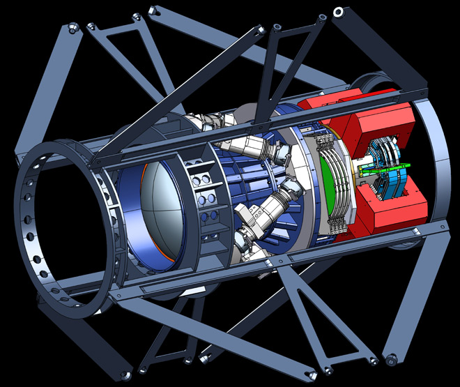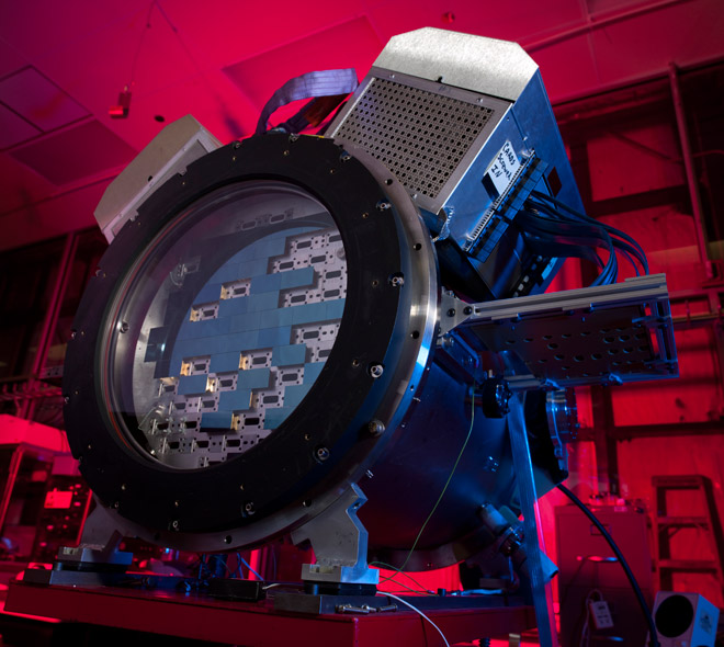 Там её сейчас тестируют, установив в крепление от телескопа (сборка крепления — на видео). А в полную силу камера заработает после установки на телескоп Виктора Бланко в горах Чили, в октябре 2012 года. Участники этого проекта собираются замерить скорость 300 млн галактик в Южном полушарии звёздного неба, чтобы проверить теорию о существовании тёмной материи. Проект Dark Energy Survey и эта 570-мегапиксельная камера уже обсуждались на Хабре, а сейчас предлагаем посмотреть фоторепортаж непосредственно с места строительства. Сборка камеры ведётся с 2008 года силами 120 астрономов, инженеров и физиков. Блок захвата изображения (imager) вмещает 74 отдельных сенсора совокупным разрешением 570 МП. На сегодняшний день в мире существует только одна камера с бóльшим разрешением: телескоп Pan-STARRS на 1400 МП, который ищет приближающиеся к Земле опасные астероиды. Но Dark Energy Camera не имеет себе равных по весу. Один только блок захвата изображения весит около 910 кг. Обоих «конкурентов» может с лёгкостью посрамить планируемый к строительству Large Synoptic Survey Telescope на 3200 МП, который тоже займётся поиском следов (эффектов) тёмной материи. Проблема только в том, что на его сооружение пока нет денег. На фотографии техник проверяет матрицу из 74 ПЗС-сенсоров. Двенадцать из этих сенсоров имеют меньшее разрешение (в сумме около 53 МП), они нужны для наведения и фокусировки телескопа. Остальные 62 сенсора (519 МП) непосредственно делают фотографии галактик. Все ПЗС сенсоры несерийные, а сделаны по спецзаказу в соответствии с необходимыми характеристиками — чтобы они были максимально чувствительны в инфракрасном диапазоне (в котором и предполагается снимать смещение удалённых галактик). Примерно такую картинку выдают все сенсоры вместе. Каждую ночь камера будет делать около 400 полноразмерных фотографий, каждая объёмом 1 ГБ. С подстанции в Чили их сразу будут отправлять для обработки и анализа в Национальный суперкомпьютерный центр в Иллинойсе (National Center for Supercomputer Applications in Illinois). Тяжеловесные детали камеры не будут висеть на самом телескопе. Для них инженеры соорудили отдельный 3,4-метровый «футляр». На фотографии внизу можно разглядеть блок с сенсорами (слева), основную оптическую систему фокусировки (справа) и две из шести пневмотрубок для наведения камеры. Телескоп Виктора Бланко расположен в одной из самых передовых обсерваторий южного полушария — Интерамериканской обсерватории Сьерро-Тололо в Чили. На схеме телескопа для масштаба изображены два человека (красный круг) и место установки Dark Energy Camera (зелёный круг). Детали самого тяжёлого в мире фотоаппарата внушают уважение. До соприкосновения с сенсорами свет проходит через четыре фильтра шириной 61 см. Они фильтруют диапазон проходящих волны, чтобы на сенсоры не попадало ничего лишнего. В инфракрасном диапазоне сенсоры будут делать, фактически, чёрно-белую картинку. Затем учёные-художники реалистично раскрасят её в разные цвета, используя научные методы (они специально рассчитывают, какой цвет логичнее всего подходит для волн определённой длины). На следующей фотографии показаны, пожалуй самые большие в мире и диафрагма и шторки затвора. Две стальные шторки спрятаны по периметру: они приходят в движение каждый раз, когда камера делает снимок. Двигаются шторки не слишком быстро, потому что для съёмки звёзд нужна длительная эксп