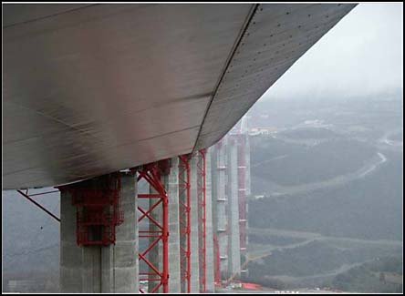 Каждая из опор поддерживает пилоны высотой 97 метров. Сначала были собраны колонны, вместе с временными опорами, затем части полотна выдвигались через опоры при помощью гидравлических домкратов, управляемых со спутника, на 600 миллиметров каждые 4 минуты.