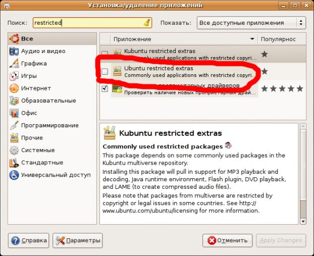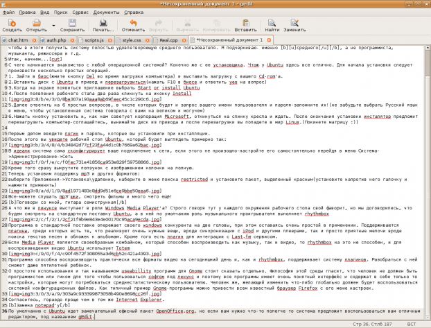 1. Зайти в биос(жмите кнопку Del во время загрузки компьютера) и выставить загрузку с вашего Cd-rom'а. 2.Вставить диск с Ubuntu в привод и перезагрузиться(нажать F10 в биосе и ответить yes на вопрос) 3.Когда на экране появиться приглашение- выбрать Start or install Ubuntu 4.После появления рабочего стала два раза кликнуть на иконку Install 5.Далее ответить на 6 простых вопросов, в числе которых будет и запрос вашего имени пользователя и пароля-запомните их!(не забудьте выбрать Русский язык в меню, чтобы установленная система говорила с вами на великом и могучем) 6.Нажать кнопку установить и, как нам советует корпорация Microsoft, откинуться на спинку кресла и ждать. После окончания установки инсталятор предложит перезагрузить компьютер-соглашайтесь, вынимайте диск из привода и после перезагрузки вы попадете в мир Linux.(Покинете матрицу )Первым делом введите логин и пароль, которые вы установили при инсталляции. После этого вы увидете рабочий стол Ubuntu, который будет выглядеть примерно так: В идеале система сама сконфигурирует ваше подключение к сети, если этого не произошло-настройте его самостоятельно перейдя в меню Система->Администрирование->Сеть Кроме того сразу выкрутите ползунок с изображением колонки на полную. Теперь установим поддержку mp3 и других форматов: выберите Приложения->Установка\удаление, наберите в меню поиска restricted и установите пакет, выделенный красным(установите напротив него галочку и нажмите применить) Все-можете слушать mp3'шки, смотреть фильмы и много чего ещё! Поговори со мной, гитара семиструнная А что же в линуксе выступает в роли Windows Media Player'a? Строго говоря тут у каждого окружения рабочего стола свой фаворит, но мы договорились, что будем смотреть на стандартную поставку Ubuntu, а в ней по умолчанию роль музыкального поигрывателя выполняет rhythmbox Программа в стандартной поставке опережает своего windows конкурента на две головы, при этом оставаясь очень простой в применении. Поддерживаются плагины, среди которых есть те, что реализуют очень нужные вещи, вроде синхронизации с iPod и другими плеерами, так и просто приятные мелочи вроде поиска текстов песен и обложек к альбомам. Кроме того есть плагин для интеграции с Last.fm сервисом. Если Media Player является своеобразным комбайном, который способен воспроизводить как музыку, так и видео, то rhythmbox на это не способен, и для воспроизведения видео Ubuntu использует Totem Программа способна воспроизводить практически все форматы видео на сегодняшний день и, как и rhythmbox, поддерживает систему плагинов. Разобраться с ней сможет даже пятилетний ребёнок. О простоте использования и так называемом useabillity программ для Gnome стоит сказать отдельно. Философия этой среды гласит, что человек не должен быть программистом или гиком для того чтобы пользоваться софтом под линукс и поэтому все программы имеют очень понятный интерфейс и содержат в себе только те настройки, которые могут потребоваться среднестатическому пользователю. Человек же, желающий изменить что-либо глобально должен будет воспользоваться системой конфигурационных файлов. Как типичный пример Gnome-программы можно привести всем известный браузер Firefox с его меню настроек. Согласитесь, гораздо проще чем в том же Internet Explorer. Замена notepad'у По умолчанию с Ubuntu идет замечательный офисный пакет OpenOffice.org, но если вам нужно что-то полегче то система предложет воспользо