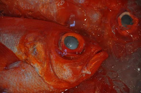 ..роскошные розовые лососи в пластиковых коробках, запечатанных в целлофан… (на мой взгляд - это моские окуни)