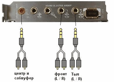 Через переходники (не помню, как называются) 2in1. Всё это дело на звуковухе занимает 3 разьема, 1 на 2 сателлита фронт, 1 на 2 сателлита тыл, 1 централка + саб.