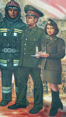 ![]() На посетителей Музея истории пожарной службы в г. Гродно с фасада здания взирает Джоконда, ставшая частью монументального произведения «Огнеборцы – история и традиции мужества». Музей истории пожарной службы в г. Гродно был открыт 10 октября 2008 года. Учреждение размещается в здании первого Гродненского депо, где также располагается городская пожарно-аварийно-спасательная часть №1. Как рассказала «Салідарнасці» заведующая музея Ирина Качан, это знаковое для гродненских огнеборцев место еще и потому, что рядом находится пожарная башня, построенная для наблюдения за возникновением пожаров в 1902 году. Заказ на создание на фасаде здания монументального произведения в технике роспись выполнял известный городской художник Владимир Качан. — За те полгода с момента открытия музея, мнения по поводу появления на его фасаде лица Джоконды поступали совершенно полярные. Да и на худсовете, который принимал мою работу также не обошлось без дискусий, — рассказал «Салідарнасці» Владимир Качан. — Но, во-первых, почему бы Гродно и не иметь свою Джоконду? Во-вторых, мне видится очевидная параллель в образах спасателей и Джокондой — они дают или спасают жизни. Мне не хотелось изображать сотрудников МЧС с лицами Шварценеггера, нужно было отразить характер их деятельности. Примененный прием заимствования из классического произведения Леонардо да Винчи, как мне кажется, здесь пришелся, как нельзя кстати. www.gazetaby.com