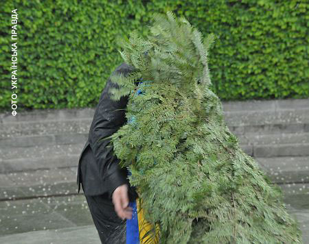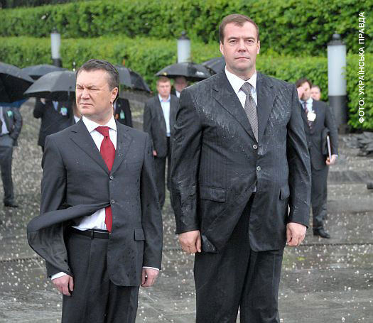 Несмотря на непогоду, президенты возложили венки у Вечного огня в киевском парке Славы, после чего поставили горящие лампадки к памятнику жертвам массового голода на Украине в 1932-33 годах. Не обошлось без маленького инцидента. Порыв сильного ветра сорвал один из венков и понес его прямо на Виктора Януковича... На помощь пришли охранники, которые вызволили шефа из неловкого положения Администрация президента неофициально запретила распространять видео с эпизодом, где президента Януковича ударило венком возле Могилы неизвестного солдата.