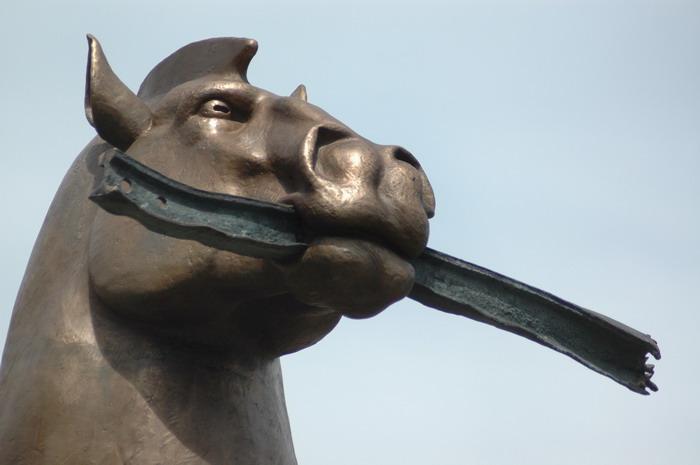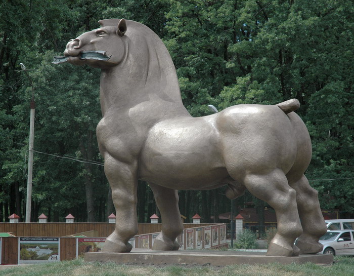 Чтобы животное не худело, ему нужно много железа в организме, поэтому конь жует кусок металла, отдаленно похожий на рельс (Спонсор статуи - Российские Железные Дороги)
