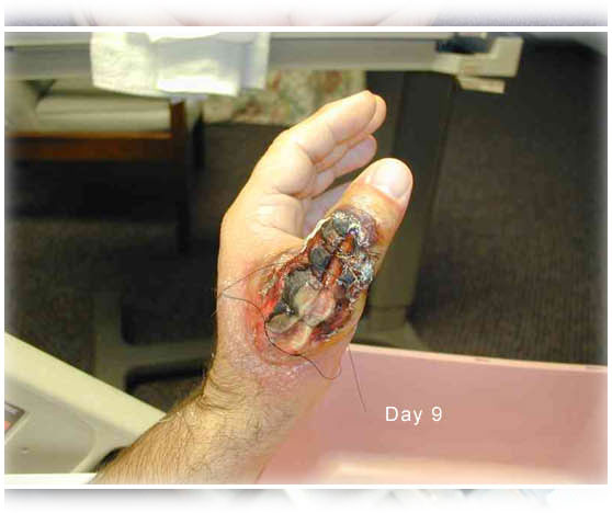 по фоткам видно, что он только на 9й день попал в больницу. Может думал, что и так заживет, а может просто был вдали от цивилизации - такое бывает