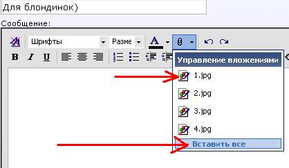 Если же нужно расположить картинки в посте (как тут к примеру) - тыкаем ту же самую скрепку и выбираем либо по одной картинке, либо же "Вставить все"