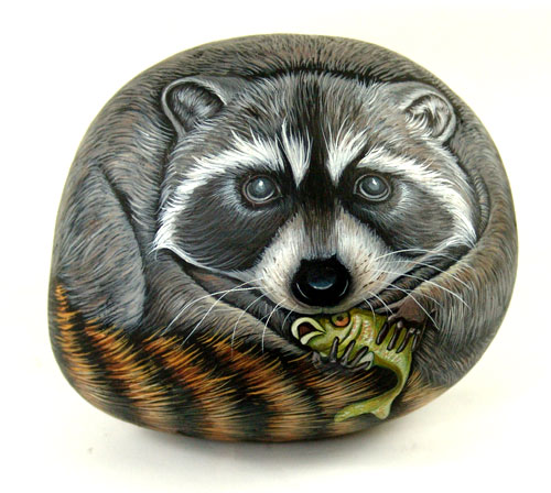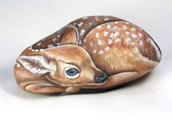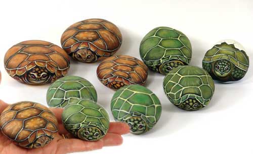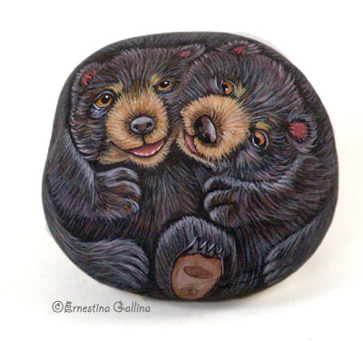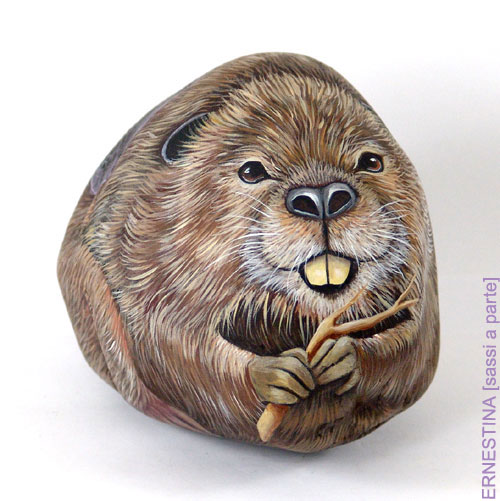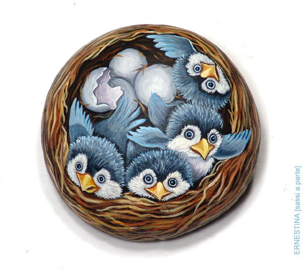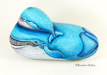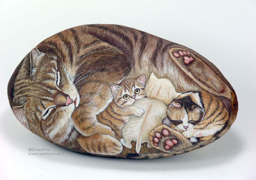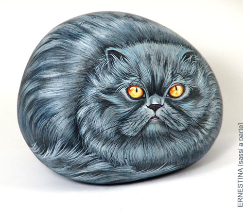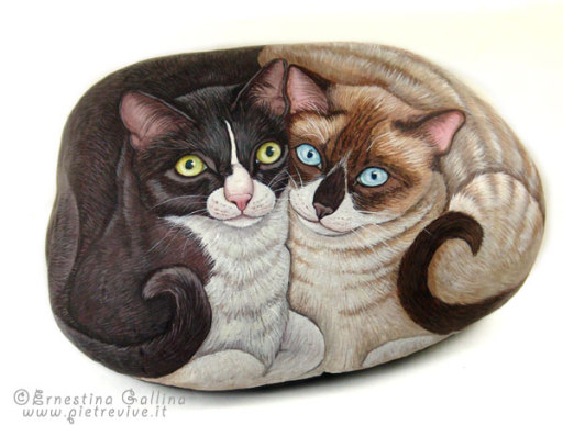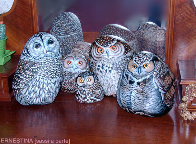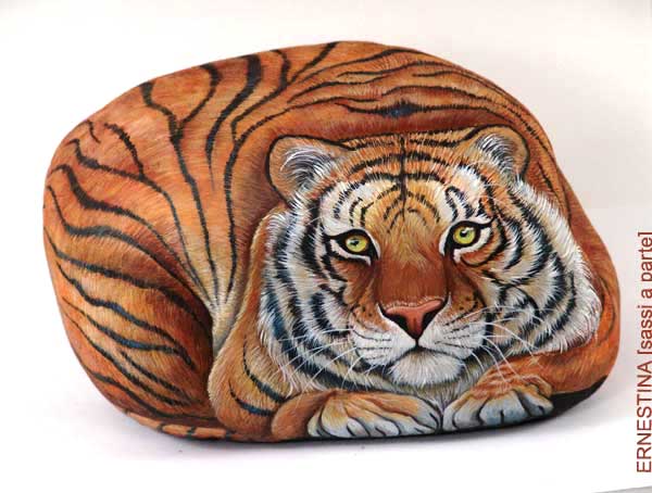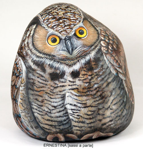 Автор этих замечательных работ — итальянка Ernestina Gallina. Она открыла для себя новый, захватывающий мир, в котором смогла объединить свою любовь и к живописи и к животным и работает акриловой краской по камню с 1996. Ее картины — продукт ее творческого воображения, объединенного с вдохновением от естественной формы камня. Обучает этому непростому искусству взрослых и детей, а в 2006 она основала итальянский клуб росписи камней (Rock Painting Club Italia on Yahoo Groups). Ее работы красуются во многих частных коллекциях и на выставках.