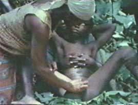 Подобная операция в одном из регионов Центральной Африки. Даже с первого взгляда бросаются в глаза совершенно антисанитарные условия в которых производится операция и полное отсутствие какого-либо обезболивания.
