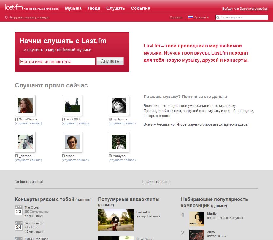 На Last.fm можно слушать музыку, узнать многое о понравившемся тебе исполнителе, познакомиться с теми, кто разделяет твои музыкальные вкусы, прочитать о событиях, получать музыкальные чарты, музыкальные мозаики для своего сайта и многое другое. https://www.lastfm.ru