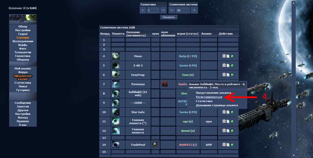 ![]() Как вступить в альянс "ХабИнфО": 1. Нажимаем «Галактика» 2. Вводим координаты 2:68 3. 8 позиция. Наводим мышкой на ХабИнфО 4. Нажимаем «Регистрироваться» и даем заявку Только для ИМПЕРАТОРОВ из 18 вселенной