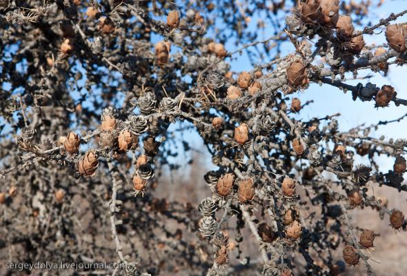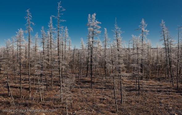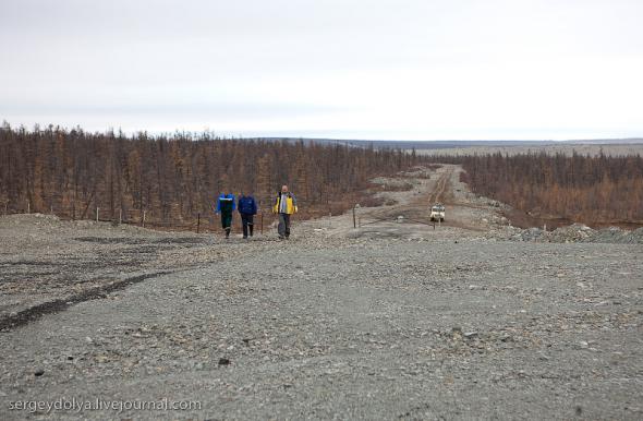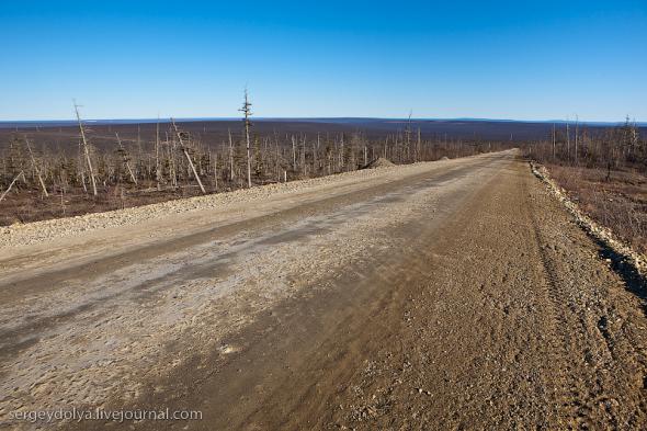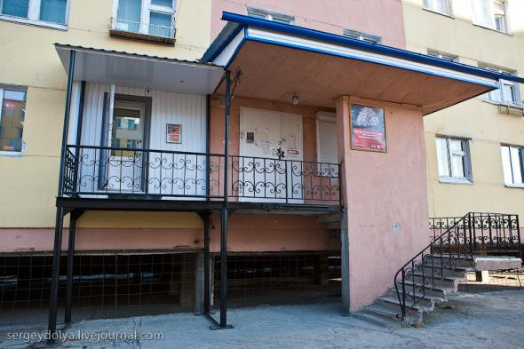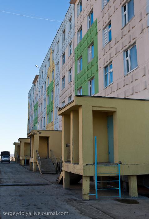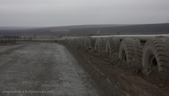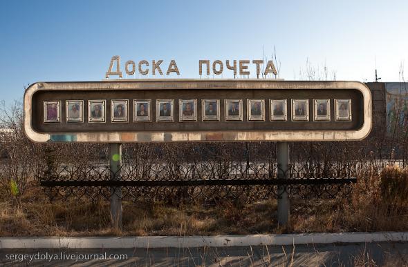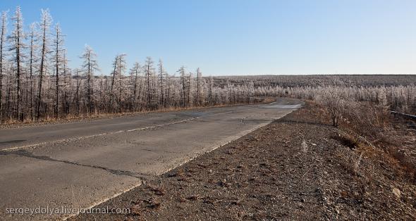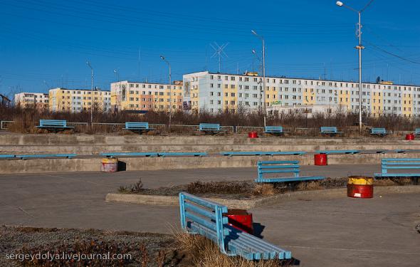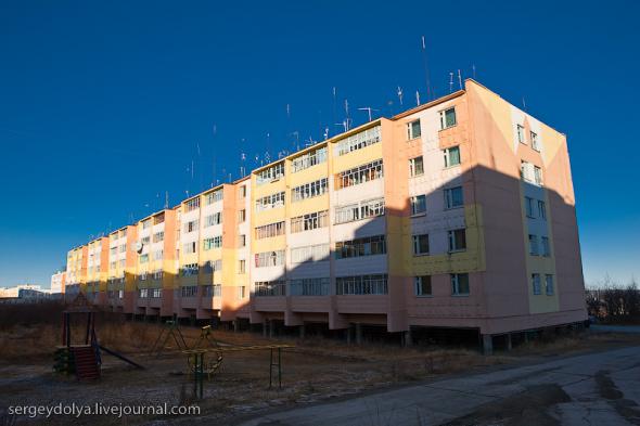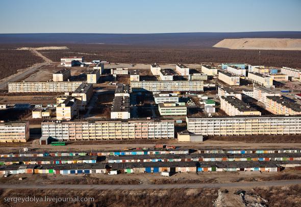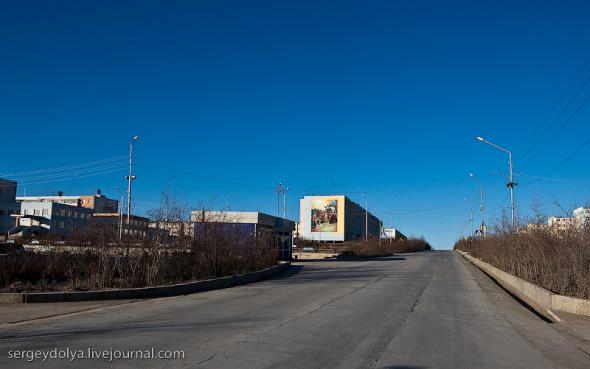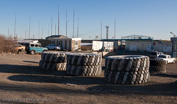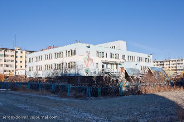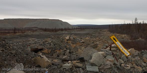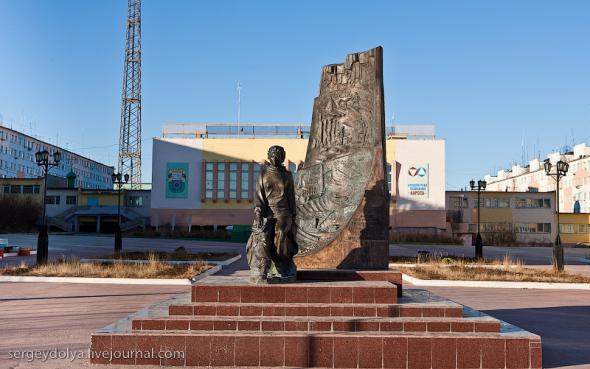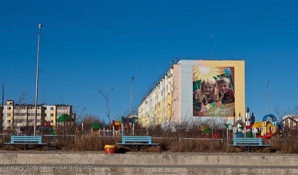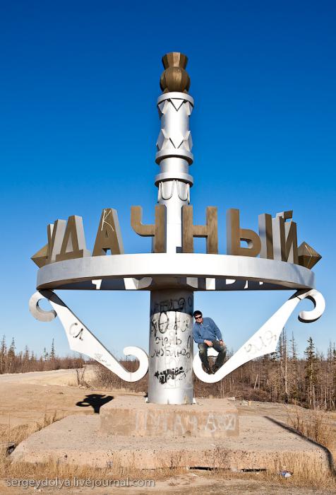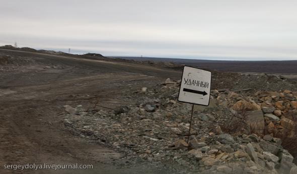 Удачный — удивительный город. Из-за вечной мерзлоты все здания здесь стоят на сваях. У улиц нет названий. У каждого дома свой номер, причем расположены они хаотично, по мере строительства. За домами тянется длинная вереница отапливаемых гаражей с разноцветными воротами. Зимой температура опускается ниже -50 и на машины приклеивают по второму лобовому стеклу. Вместо памятников здесь стоят списанные гигантские экскаваторы и самосвалы. Но самое удивительное здесь то, что это город с самой высокой концентрацией детских площадок на каждого жителя... Дорога из аэропорта проходит через низинку. Утром все лиственницы покрылись снегом: С какой стороны вы бы не въезжали в Удачный, вы обязательно увидите стелу или указатель, предупреждающий вас о близости к городу: Все дома в Удачном стоят на сваях и облеплены телевизионными антеннами: Подъезды выглядят как курятники: Первые этажи домов отданы под магазины: Асфальт в местных погодных условиях не выживает, и покрытие на дорогах из бетона: Урны сделаны из бочек и смотрятся очень живописно: В городе очень много детских площадок. В каждом дворе есть минимум одна горка и лазилка для детей: Несколько детских садиков и школ: Детей в школу отвозят на школьном автобусе: Вместо ограждений используются огромные колеса от Катеров: Перед административным зданием установлена доска почета: В центре города стоит памятник Ларисе Анатольевне Попугаевой — геологу, первооткрывателю кимберлитовой трубки в Советском Союзе: Но самый заметный памятник стоит перед въездом в карьер. Это свежевыкрашенные гигантский экскаватор и карьерный самосвал Caterpillar (см. заглавную фотографию): За городом все дороги грунтовые. Местные без двух запасок в дальнюю дорогу не выезжают. Колеса изнашиваются за один сезон: Еще несколько наблюдений: Местные называют свой город Удачка: "Я был в Удачке" или "Завтра съезжу в Удачку". Себя считают островитянами и обо всей другой России говорят как о материке: "Я в прошлом месяце был на материке" или "Мне с материка лобовик привезли" Между собой говорят только об охоте или работе: "Что там на 14-ой фабрике?", "А как там наш Иванов у Вас работает?", Сколько в прошлом месяце у вас ремонтов было?". Ну, а охота здесь — это в первую очередь олени. Когда мы были в Удачном к городу, с севера, приближалось огромное стадо оленей длиной в 15 километров. Все только об этом стаде и говорили и пытались угадать, когда оно к Удачному приблизится. Запомнился рассказ о Катоке. Там, в Анголе, Алроса так же разрабатывает месторождение алмазов, и частая проблема там состоит в том, что крокодилы забиваются в дренажные трубы, и вода затапливает карьер. Их пытаются выгнать электрическими разрядами, но те отчаянно сопротивляются. 2 октября 1974 в районе Удачнинской трубки, в 2,5 километрах к северу от города Удачный и карьера алмазоносной трубки «Удачная», был произведён ядерный взрыв на вспучивание мощностью 1,7 килотонны под названием «Кристалл». Предусматривалось проведение восьми взрывов для создания плотины Удачнинской горно-обогатительной фабрики, но из-за аварийной ситуации с выбросом на поверхность продуктов взрыва от замысла отказались. (материал взят из Википедии) Мы там были ровно через 35 лет после взрыва. Место обнесено колючей проволокой, а сверху построен саркофаг из пустой породы, глубиной 20 метров: Страница Ви