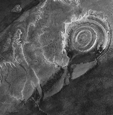 Структура Ришат, расположенная в пустыне Сахара на территории Мавритании, хорошо заметна из космоса благодаря своим огромным размерам - ее поперечник составляет почти 50 километров. А почти идеально круглая форма этого образования до сих пор заставляет спорить учёных что это – кратер от удара метеорита, жерло потухшего вулкана или… место высадки инопланетян…