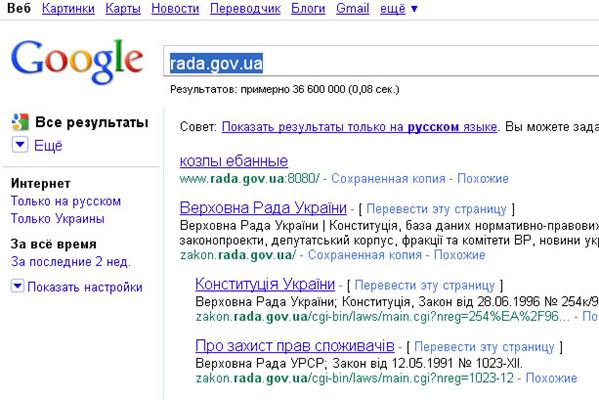 На сайт Верховной Рады Украины совершена хакерская атака. На запрос rada.gov.ua поисковая система Google, первой строкой выдает матерную характеристику собранию депутатов.