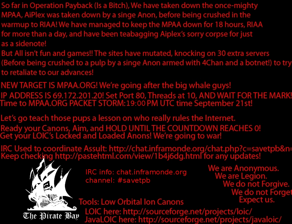 Судя по сообщению TorrentFreak, в ходе рейда использовалась программа LOIC (Low Orbit Ion Cannon), предназначенная для тестирования нагрузки на сервера.