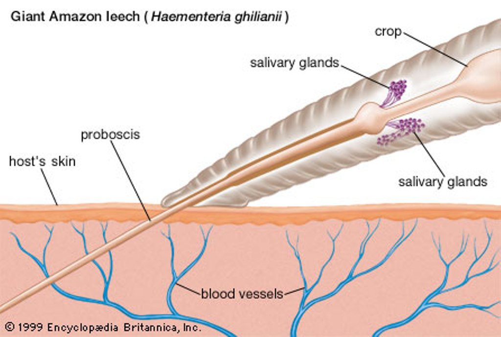 Амазонская пиявка относится к виду хоботковых пиявок. Поэтому ее глотка выдвигается наружу. Своеобразный "хоботок" может вытягиваться до 15 сантиметров в длину, поэтому она с легкостью протыкает кожные покровы и добирается до достаточно крупных кровеносных сосудов. Как представлю себе эту картину, в дрожь бросает.