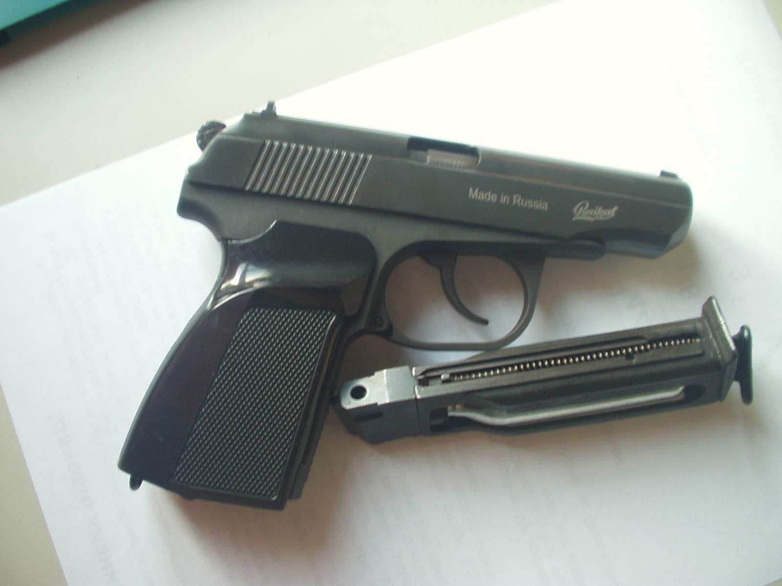 Пневматический пистолет Макарова МР 654 К Популярный газобаллонный аналог пистолета Макарова. Идеальное оружие для получения первоначальных навыков в обращении с оружием и развлекательной стрельбы. Внешний вид оружия, механическая прочность, надежность конструкции, удобство в обращении и качество изготовления и сборки всех деталей и узлов оружия идентичны ПМ. Ударно-спусковой механизм пистолета позволяет вести стрельбу как самовзводом, так и с предварительным взведением курка. При постановке оружия на предохранитель при взведенном курке происходит безопасный спуск курка, аналогично прототипу. Стреляющее устройство — магазин, клапан и баллончик с углекислотой образует единый отдельный блок, который вставляется в рукоятку, аналогично магазину. Для стрельбы используются стальные сферические пули, применяются 8 или 12 граммовые баллончики с СО2. Калибр, мм: 4,5 Тип: CO2 Скорость пули, м/с: 120 Тип боеприпаса: Стальные шарики ВВ Зарядность: 13 Вес, кг: 0,73 Ствол: Нарезной Прицельное приспособление: Стандартное Предохранитель: Присутствует Материал рукояти: Пластик Покрытие: вороненый Цена: 1100 грн. (торг) В комлект входит: - запасные прокладки для клапана - приспособления для чистки и уходом за оружием - специальный чистящий материал для ствола + оперативная кобура (для ношения под мышкой) + 1000 "убойных" алюминевых шариков (не плющатся) + 1 балон CO2 примечание: - выстреляно всего 10 баллонов - при использовании алюминевых шариков с растояния 5 метров пивная банка простреливается насквозь +38 067 427 94 71 gigantshum@mail.ru |