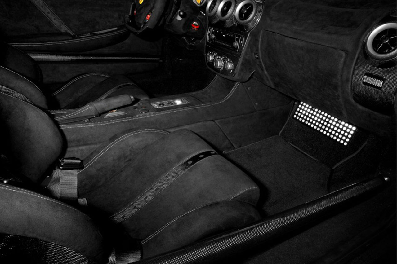 В результате проделанной работы мощность силового агрегата увеличилась до 707 л.с. при 8 350 об/мин, а максимальный крутящий момент теперь составляет 712 Нм при 6 300 об/мин. Как утверждают создатели, двигатель, работая в паре с модифицированной трансмиссией от Novitec, способен разгонять этот черный болид до 348 км/ч, а до 100 км/ч F430 TuNero ускоряется за 3,5 с.