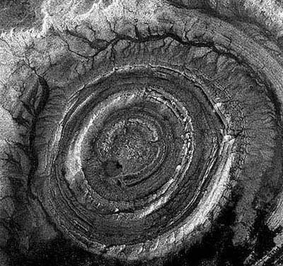 Структура Ришат, расположенная в пустыне Сахара на территории Мавритании, хорошо заметна из космоса благодаря своим огромным размерам - ее поперечник составляет почти 50 километров. А почти идеально круглая форма этого образования до сих пор заставляет спорить учёных что это – кратер от удара метеорита, жерло потухшего вулкана или… место высадки инопланетян… |