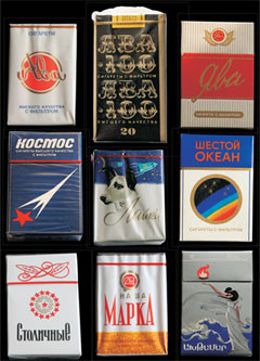С табачными изделиями в позднем СССР дело обстояло далеко не самым плохим образом. Разумеется, если говорить о качестве сигарет, то оно было весьма скверным, зато сортов было много и продавались они до 1987 года повсеместно и регулярно. Потом, правда, начались серьезные перебои, а в 1990−м и вовсе случился масштабный табачный кризис — с многочасовыми очередями и толпами возмущенных курильщиков, в гневе перекрывающих улицы. Впрочем, этот период мы трогать не будем, а вспомним о «золотой осени» советского режима — начале-середине 80−х. Из более или менее традиционных сортов лучшими сигаретами считались «Космос». Их выпускали на многих табачных фабриках. Самым качественным считался сухумский, потом тбилисский и кишиневский и только потом московский (фабрики «Ява») — все в твердой пачке. Прочие варианты (например, моршанский или ленинградский) и разновидности в мягкой пачке не котировались. Стоил «Космос» вне зависимости от места производства и упаковки 70 копеек, курить его считалось весьма солидно, хотя и не шикарно. «Шикарно» было курить Marlboro, культовый бренд 70–80−х, советский символ «красивой жизни», примерно как джинсы Montana (где они теперь?) и кроссовки Adidas. О Marlboro, впрочем, отдельно. У «Космоса» были и «элитные» родственники. Легендарные сигареты «Союз-Аполлон», созданные в 1975 году вместе с «Филип Моррис», к середине 80−х уже исчезли, зато можно было купить подарочные сигареты «Зодиак», продававшиеся в специальной упаковке по 12 пачек (соответственно 12 знакам Зодиака). Стоили они по 90 копеек за пачку, и наряду с еще одной «облагороженной» версией «Космоса» — «Шестым океаном» — были самыми дорогими нелицензионными советскими сигаретами. Другой сверхпопулярный, хотя и более демократичный сорт — «Ява». Впрочем, тут надо сразу оговориться: «Ява» выпускалась в Москве, на фабриках «Ява» и «Дукат», обе стоили 40 копеек и выглядели почти одинаково, но для советского человека между «Явой явской» и «Явой дукатовской» была дьявольская разница. Первая считалась хорошей и «приличной к употреблению», вторая — сильно хуже. Была еще и «дубовая» «Ява» в твердой пачке, которая, несмотря на более высокую цену (60 копеек), почему-то котировалась весьма средне. Еще существовала длинная «дамская» «Ява-100» (80 копеек), но особого успеха, в том числе у дам, не имела. Еще одни «сорокакопеечные» сигареты, дукатовский «Пегас», считались посредственными, равно как и многочисленные шестидесятикопеечные дукатовские сорта («Друг», он же «портрет тёщи», «Столичные», они же «столбы», «Тройка»). Недолгое время выпускались сигареты «Дукат» (40 копеек) но это был не более чем ухудшенный вариант «Пегаса». На «Яве» делались также дорогие (80 копеек) и считавшиеся «пафосными» сигареты «Герцоговина Флор», а также ароматизированные «Золотое руно» (70 копеек). Из-за специфического вкуса оба сорта, особенно «Руно», считались «сильно на любителя». Другие сигаретные сорта московских фабрик — укороченные «Краснопресненские», «Лайка», «Новость» (все по 30 копеек)— особой популярностью не пользовались. Про «Новость», впрочем, ходили легенды, что это были любимые сигареты Брежнева и что выпускались «спецпартии» этих сигарет с роскошным табаком. Подтвердить или опровергнуть эту легенду мы затрудняемся. А однажды случился своего рода конфуз. В середине 80−х на «Яве», видимо, в прист