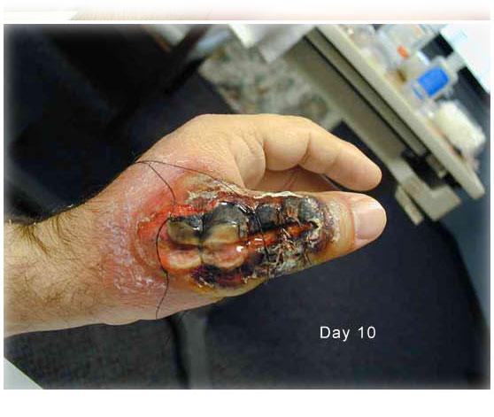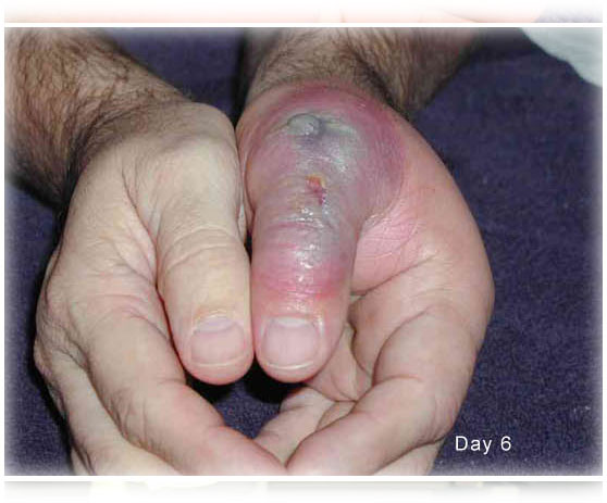 по фоткам видно, что он только на 9й день попал в больницу. Может думал, что и так заживет, а может просто был вдали от цивилизации - такое бывает