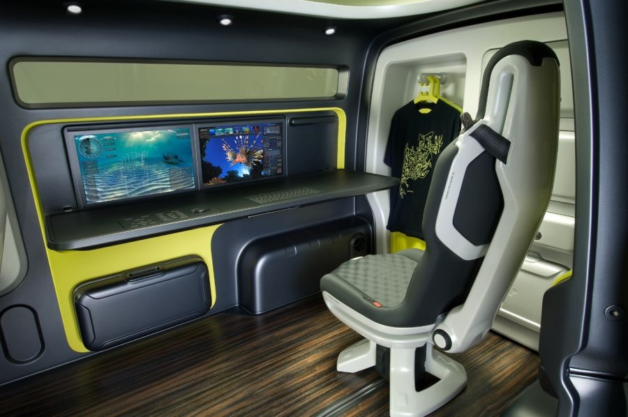 Когда багажный отсек выдвинут, интерьер вэна превращается в мобильный офис. Управляющая панель, выдвигающаяся со стороны вэна, содержит два ЖК-монитора, а сопроводительный лэптоп находится в противоударном чемодане, расположенном под панелью. Свет проходит в помещение из длинного узкого окна над мониторами и окна на крыше. На внутренней стенке грузового отсека можно разместить одежду, также там предусмотрена раковина, холодильник и аптечка. Кабина оснащена алюминиевыми сиденьями, покрытыми моющейся тканью, используемой в спортивной обуви, и содержит большое пространство под приборной панелью. Очевидно, что Nissan не мог оборудовать такой фургон тривиальным зеркалом заднего вида, отдав предпочтение портативному цветному телевизору, транслирующему сигнал с камеры заднего вида, обычно служащей в качестве гида для парковки. В кабине также есть окно на крыше в виде волнистого узора для того, чтобы свет был рассеянным. Главные цвета интерьера: серый и кислотно-желтый, внешнее покрытие автомобиля с защитой от царапин выкрашено в темно-серый цвет для подчеркивания концепции «инструментальной панели» вэна. “Мы хотели создать гибкую инструментальную панель для профессионалов”, говорит Стефан Шварц, главный дизайнер бюро Nissan Design Europe. Остается только гадать, какова вместимость вэна при движении? В конечном счете, на фургоне нужно еще и ездить. Детальной информации о технической начинке концептуального NV200 пока не представлено.