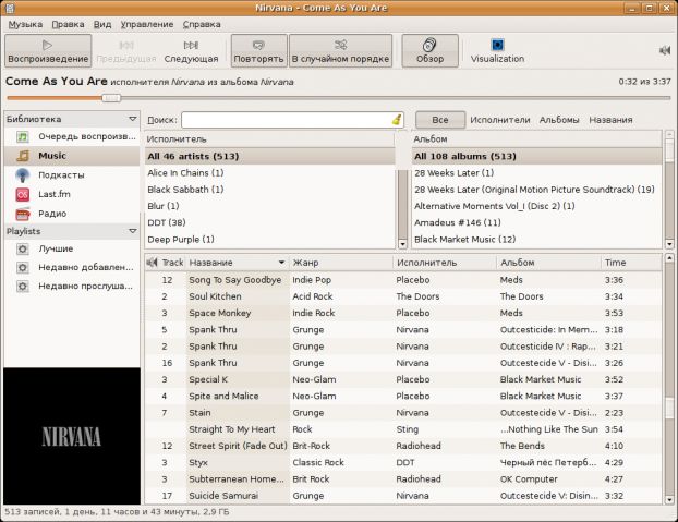 А что же в линуксе выступает в роли Windows Media Player'a? Строго говоря тут у каждого окружения рабочего стола свой фаворит, но мы договорились, что будем смотреть на стандартную поставку Ubuntu, а в ней по умолчанию роль музыкального поигрывателя выполняет rhythmbox