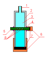 Теперь хотел бы поведать о конструкции мультикомпрессионной приставки. Эта конструкция является доработанной приставкой, которая была представлена в первой статье. По сути различия этих двух конструкций не велико. Первое, в данной модели используется шланг от машинного или мопедного насоса с обратным клапаном. Второе, уменьшен диаметр насоса. Его диаметр должен быть как можно меньше, если есть возможность, то лучше изготовить корпус насоса самостоятельно, желательно из трубки внутренним диаметром 1-1.2см (т.к. промышленных образцов с таким внутренним диаметром я найти не смог), можно и больше, можно и меньше. При меньшем диаметре, можно достичь большего сжатия, но качать придётся дольше (это еще зависит от объёма и прочности накопительной камеры), при большем диаметре, качать надо будет меньше, но для достижения той же степени сжатия придется прикладывать большее усилие. Но, в общем, параметры такого насоса могут быть любые, в зависимости от того, что вы хотите получить в результате. Третье, изменена конструкция приставки к переходнику. Для этого можно использовать всё тот же 8-ми граммовый баллончик или изготовить накопительную камеру самостоятельно. Вариант использования 8-ми граммового баллончика в качестве накопительной камеры: 1.Корпус баллона. 2.Полость баллона. 3.Заглушка. 4.Золотниковая трубка от машинной камеры. 5.Прокладка. 6.Места спайки. 7.Перепускные отверстия. Хочу заметить, что трубку можно и не впаивать, если поставить прокладки в местах для спайки и туго прижать их гайками через шайбы. Самодельный вариант накопительной камеры: 1.Перепускная трубка (равная по диаметру стандартной баллонной). 2.Корпус камеры. 3.Полость камеры. 4.Места для спайки. 5.Золотниковая трубка от машинной камеры. 6.Заглушки. 7.Прокладки. 8.Перепускные отверстия. Хотелось бы сразу заметить, что для надёжной работы данного механизма необходимо усилить всю конструкцию. В частности поршень, рычаг и желательно максимально туго обмотать бандажом шланг т.к. если всё будет сделано и собранно качественно, и прочности конструкции будет достаточно, то удастся достичь приличного давления, при котором шланг может не выдержать и лопнуть. Для надёжности нужно также хорошенько отшлифовать внутреннюю поверхность цилиндра и сам поршень. Это можно сделать, как уже где-то описывалось, намотав, на болванку с пропилом (пропил нужен для фиксации шкурки, а сама болванка меньше внутреннего диаметра цилиндра), посаженную на какой либо стержень, мелкую шкурку. Болванка имеет такой вид: 1. Корпус болванки. 2.Пропил для крепления шкурки. 3.Стержень, на котором крепится болванка. Затем стержень болванки, предварительно всунутой в цилиндр, зажимают в патроне дрели и начинают обработку цилиндра. С поршнем дело обстоит немного сложнее. Но в общем, если удастся, как ни будь закрепить его в патроне дрели или просто в тисках. Но при этом необходимо чтобы вся его поверхность была свободна. Затем берёте в руки шкурку и начинаете движения взад и вперёд вдоль поверхности поршня (если он зажат в тисках). Или просто хорошенько обжимаете его рукой со шкуркой и включаете не на долго дрель и так до тех пор, пока его поверхность не будет удовлетворять ваших желаний. Теперь о манжете на поршне. Разность диаметров поршня и внутреннего диаметра цилиндра не должна превышать 1мм, чем меньше эта разнос