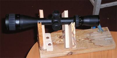 Рассмотрим результаты установки оптического прицела на винтовку. "Идеальный" - планка ластохвоста расположена четко над осью ствола и параллельна ей, кронштейн-моноблок сел креплением идеально на ластохвост и центральная ось колец тоже параллельна оси ствола и наконец - оптическая ось прицела параллельна оси ствола. "Нормальный" - ластохвост расположен под углом к оси ствола, кронштейн-моноблок сел креплением под углом к планке ластохвоста, центральная ось колец регулируется по горизонтали и вертикали и коррекцией доведена до параллельности к оси ствола, как следствие оптическая ось прицела параллельна оси ствола. "Неудачный" - ластохвост расположен под углом к оси ствола, кронштейн-моноблок или кольца сели креплением под углом к планке ластохвоста, центральная ось колец грубо регулируется подкладыванием в кольца тонких прокладок, оптическая ось прицела не параллельна оси ствола, а сетка приводится в ноль серьезными поправками по горизонтали и вертикали. "Идеальный" в природе не встречается, "Неудачный" - это то, что есть у подавляющего большинства стрелков с кронштейнами и кольцами без регулировочных винтов, а переход от "Неудачного" к "Нормальному" случаю, мы и будем рассматривать в этой статье. Процесс регулировок кронштейна зависит от конкретного кронштейна и рассматривается, например на сайте Hans'а в статье по регулируемым кольцам B-Square. В этой статье мы рассмотрим только приведение сетки к оптической оси прицела в домашних условиях. Исторически сложилась практика просто приводить движки (барабаны) поправок прицела в среднее положение путем деления диапазона кликов пополам. Но, на самом деле, нет никаких общих правил, которые бы заставляли производителя помещать сетку точно на оптической оси в середине диапазона поправок прицела. И даже наоборот, прицелы созданные специально для пневматики обычно имеют запас поправок по вертикали, для того, чтобы обеспечить перенос нуля на большие дистанции при крутой траектории полета пули, свойственной пневматическому оружию. Ходят слухи , что на Западе существуют специальные станки промышленного изготовления для точных установок кронштейнов и настройки оптических прицелов на винтовках. Не сомневаюсь, что так оно и есть, хотя бы для упрощения процесса настроек при поточном производстве и продаже винтовок с предустановленными оптическими прицелами. Главный плюс такого станка - это отсутствие фактора человеческого зрения, влияния параллакса и ошибок вращения прицела, как главных причин неточности приведения сетки к оптической оси прицела.Сама задача у меня возникла после приобретения регулируемого кронштейна Sportmatch AOP55, до этого я пользовался кольцами и при смене нуля вносил поправки как по вертикали, так и по горизонтали. Сетка прицела BSA AR 3-12x44, естественно, была смещена для компенсации расхождения осей на нуле 35м, как ниже будет указано расхождение было ~4см на 6м, что значит, что ось прицела была отклонена от оси ствола на 0.382 градуса или 23см на 35м. Итак, приступим к делу. Для начала необходима некоторая материально-техническая подготовка. Необходимо изготовить небольшой станочек (рис. 1). Рис.1 Схема станка (Seva), и что вышло у меня (svar45) за 15 мин. из обрезков вагонки. Его можно сделать, например, из фанеры - "десятки" или из гетинакса или еще из чего нибудь. Состоит станок из основа