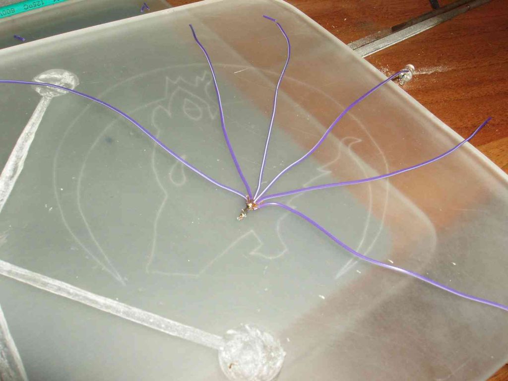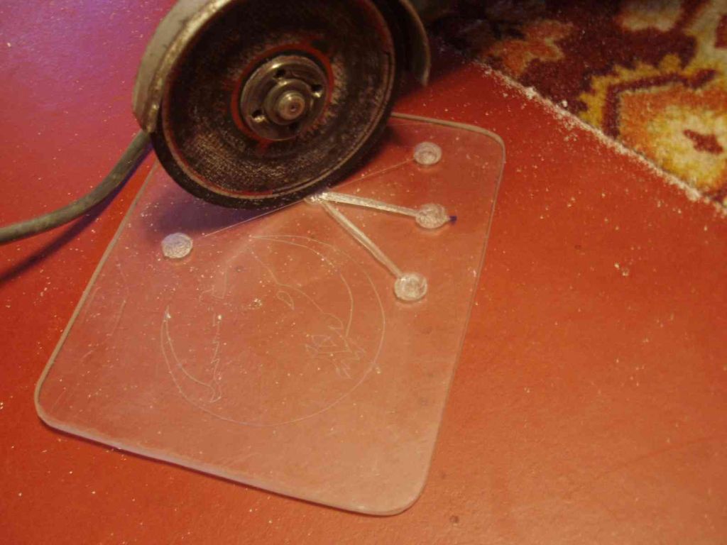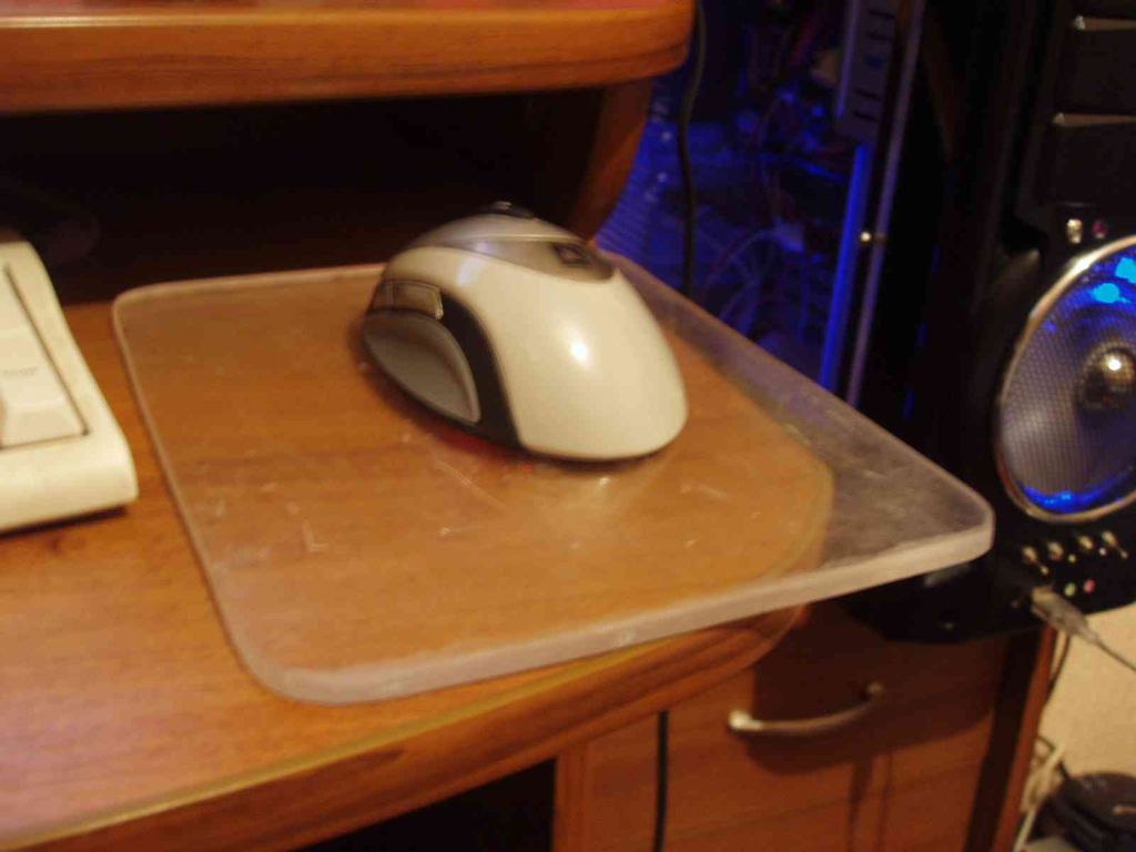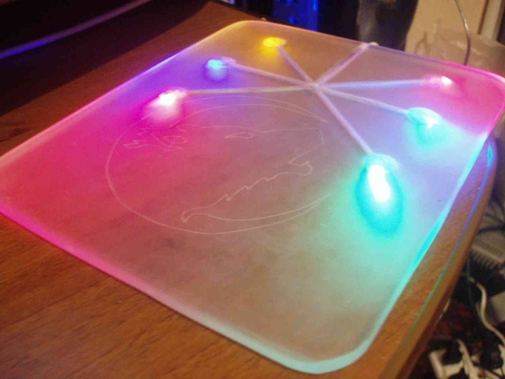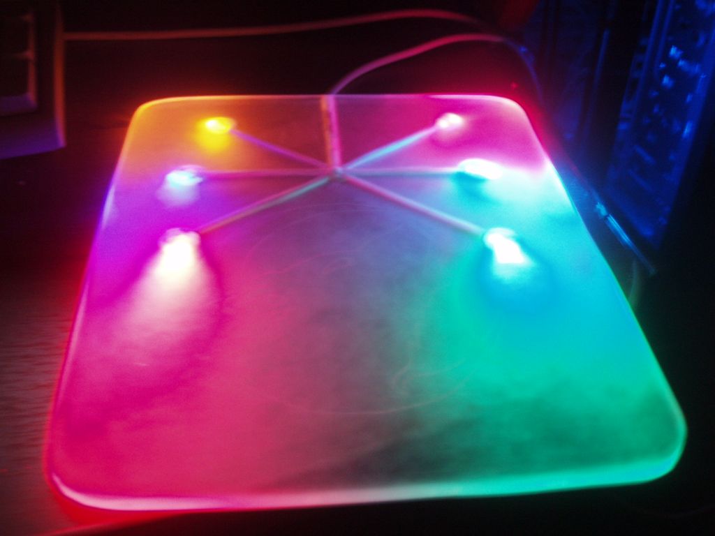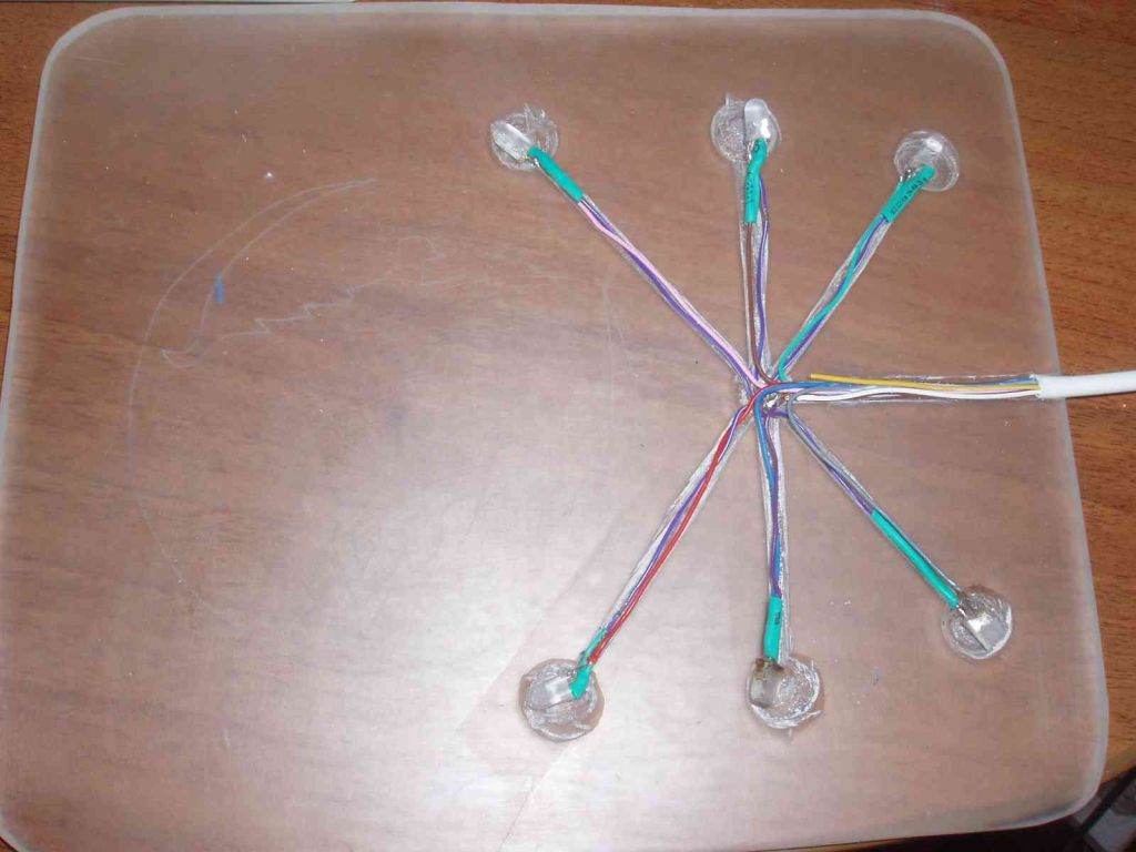 И так, что нам нужно: 1. Оргстекло (В моем случае это был старый, найденный в подвале потертый кусок оргстекла 20x30). 2. 6 светодиодов диаметром 5 мм. разных цветов. (у меня оранжевый, зеленый, два красных, синий и фиолетовый). 3. LPT кабель, а точнее разъем от него для подключения к материнской плате (Кабель от принтера). 4. Кабель восьми жильный (Только НЕ витая пара, чем тоньше, тем лучше), т.к. стандартный от LPT кабеля мне показался очень толстым. 5. Термоусадка для изоляции проводов. 6. Паяльник, канифоль, олово. 7. Дреммель (в моём случае это был электролобзик и “болгарка”). 8. Напильники, надфили. 9. Самоклейка, я использовал серую самоклейку, поверх которой, я наклеил ещё слой прозрачной самоклейки для стекла с неровной, шершавой поверхностью, типа узора, почему? Оптическая мышка не захотела работать на гладкой поверхности, т.к. нужна неровная шершавая поверхность. 10. Наждачная бумага «Нулевка». 11. Скотч. 12. Руки (Желательно прямые) Внимание! Автор не несет никакой ответственности, если вы, что либо спалите, сломаете, сожжете или испортите. В этом будете виноваты только вы сами. Все схемы, файлы и инструкции полностью рабочие и неоднократно проверялись. Если вы будите следовать указаниям, то все получиться как надо. Итак, начнём с изготовления самого коврика: Сначала возьмем наш кусок оргстекла разметим форму будущего коврика… Я решил делать стандартный прямоугольный 17.5 x 21 см. коврик с закруглёнными краями. Маловат, конечно, но для меня в самый раз. Выпиливаем наш коврик по нарисованному контуру, для этого я использовал электролобзик. Но при наличии дремеля это делается проще и быстрее. После этого, напильником обрабатываем ту сторону, на которую будет ложиться рука. Нужно сточить угол, для того чтобы угол не натирал руку. Остальные три стороны стачивать не обязательно. Так как мой коврик будет с рисунком, я решил разметить, где будет находиться рисунок. Это нужно для того, чтобы углубления под провода не пересеклись с рисунком. Далее нужно разметить, где у нас будут проходить углубления для проводов и светодиодов Отверстия под светодиоды я высверливал дрелью ( Тут нужно быть аккуратным, чтобы не просверлить оргстекло на сквозь)… а углубления под провода я делать болгаркой. При работе болгаркой нужно чтоб один человек держал наш будущий коврик, а другой естественно выпиливал каналы под провода… Здесь нужно быть крайне осторожным, чтоб не задеть помощника. =) И вот, что получается: И так, когда углубления под провода и светодиоды сделаны, нужно зашкурить коврик со всех сторон мелкой наждачкой, это нужно для того, чтобы свет от светодиодов лучше рассеивался по всему коврику. Наждачку лучше смочить водой – будет меньше пыли и зачиститься лучше. Результат должен быть вот такой: Первый этап работы закончен! Теперь приступим к проводке. Берем LPT разъем. От этого шнура оставляем только LPT разъем, т.к. кабель от него показался мне очень толстым (В нем 25 жил, а мы будем использовать только 7) отдельно я купил два метра восьми жильного кабеля. Берём наш кабель и LPT разъем, припаиваем 6 проводов на контакты от2 до7 как показано на схеме. (Зеленым цветом обозначены контакты на которые будем паять провода). И еще один провод паяем на землю, то есть на сам корпус LPT разъема, на землю я паял белый провод…а восьмой оставшийся провод просто отрезаем, т.к. он нам не понадобиться