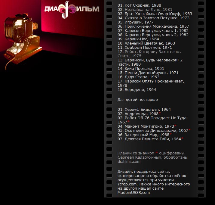 ![]() Помните ли вы о существовании такого устройства, как фильмоскоп. Молодым же расскажем, что в эпоху, когда еще не изобрели ни DVD-проигрывателей, ни видеомагнитофонов, просмотр диафильмов был одним из любимейших развлечений советской детворы. Задумка авторов ресурса очень симпатична – передвижение кадров «заряженного» диафильма очень напоминает реальное. Поскольку сайт новый, то и коллекция пока невелика. https://diafilms.com
