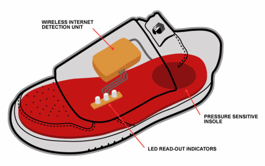 Дизайнеры со странными именами MSTRPLN и Ubiq объединились и произвели на свет с виду обычные черные кроссовки Nike. Приглядевшись, можно заметить три маленьких диода, которые связаны с устройством обнаружения беспроводных сетей и указывают на мощность сигнала.