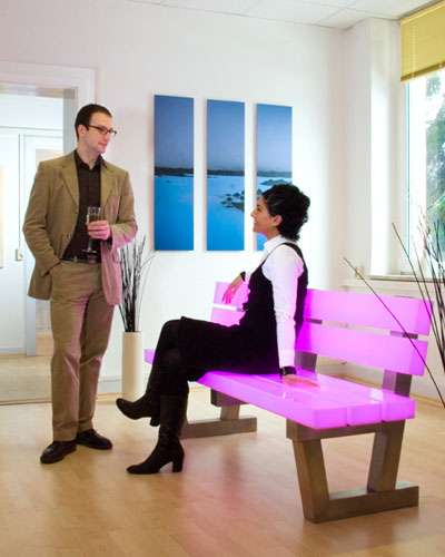 ![]() Даже не фонарик, а прожектор, поскольку вечером ее видно очень далеко и очень хорошо. Когда читаешь о таких девайсах, жалеешь, что городские парки не оборудованы такими же. Ведь иногда несколько раз придется обойти все парки в округе, чтобы найти уютную скамейку, скрытую от посторонних глаз. А так светится - значит, свободно. Не светится, значит, занято, и свет не пробивается сквозь сидящие тела. Светящиеся скамейки могут стать и отличным украшением как территорий при офисах и магазинах, так и детских площадок. Во-первых, на них и сидеть интереснее, и ребенка можно увлечь рассматриванием скамейки, а если она еще и меняет цвет в процессе сидения на ней - как минимум, на полчаса малышу будет, чем заняться, а мама получит возможность спокойно пообщаться с подругами или поговорить по телефону о делах. Если же ставить скамейку-прожектор на территории офиса, можно украсить ее логотипом предприятия - и он будет очень красиво светиться в темноте. А поскольку цвета подсветки можно выбрать какие угодно, есть шанс, что найдутся и корпоративные.