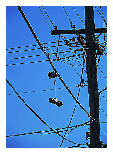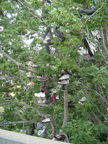 ![]() Шуфити - направления стрит-арта. Это ботинки (кеды, кроссовки), связанные шнурками и заброшенные на деревья или линии электропередач. Авторство названия «шуфити» принадлежит Эду Колеру из Миннеаполиса: однажды он настолько был восхищен таким произведением, случайно сделанных им самим, что в 2005 г. создал веб-сайт www.shoefiti.com, на котором собирает фотографии и статьи, посвященные этому феномену.