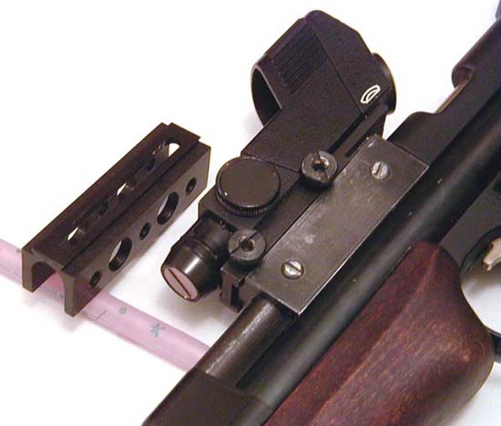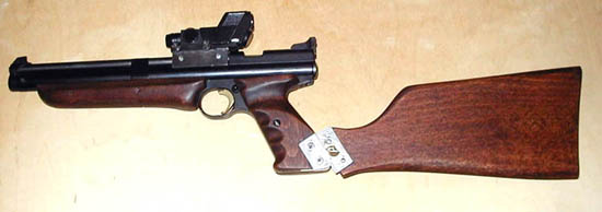 Пистолет с новым деревянным прикладом, рукояткой и цевьем. Все выполнено из бука. Крепление для коллиматорного прицела для установки прямо на ствол. Источник: airgun.narod.ru