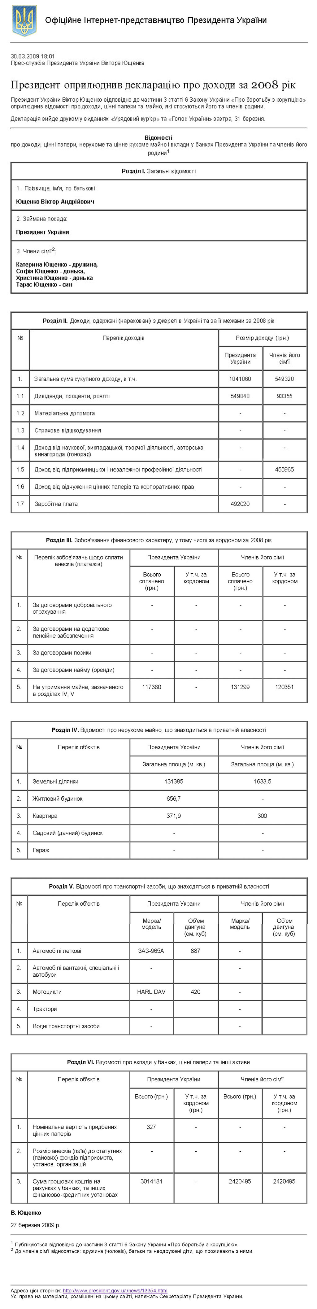 Президент України Віктор Ющенко відповідно до частини 3 статті 6 Закону України «Про боротьбу з корупцією» оприлюднив відомості про доходи, цінні папери та майно, які стосуються його та членів родини.