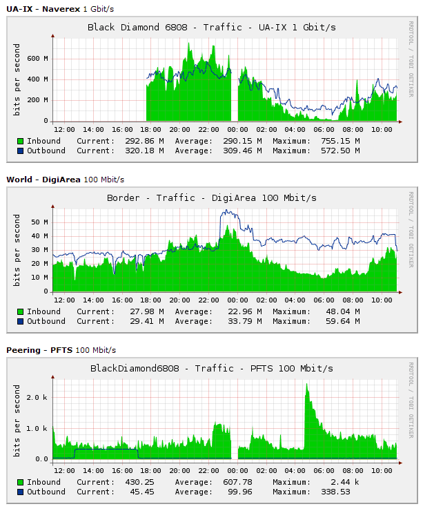 Ночью в UA-IX прыгнуло за 600 Мбит. Да и мир поднялся.