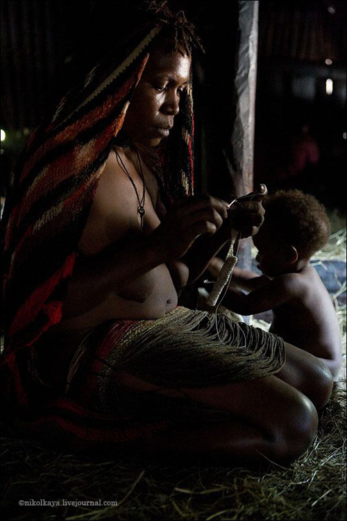 Племена Дани живут большими семьями общим двором по 30-50 человек. Женская половина вместе с кухней и свинарником, но отдельно от мужского дома, куда нас не пустили. Есть специальный дом для ночных свиданий супругов, по очереди. У Дани может быть несколько жен. Одна жена стоит 4-5 свиней. У главы семьи, где были мы (на фото) - 4 жены, 8 детей (4 сына, двое из них женаты и имеют по 2 жены). Свинья стоит очень дорого. Маленький поросенок - 100 долларов, большая свинья - до 3 тысяч. К примеру, огромная корова стоит всего 300 долларов.
