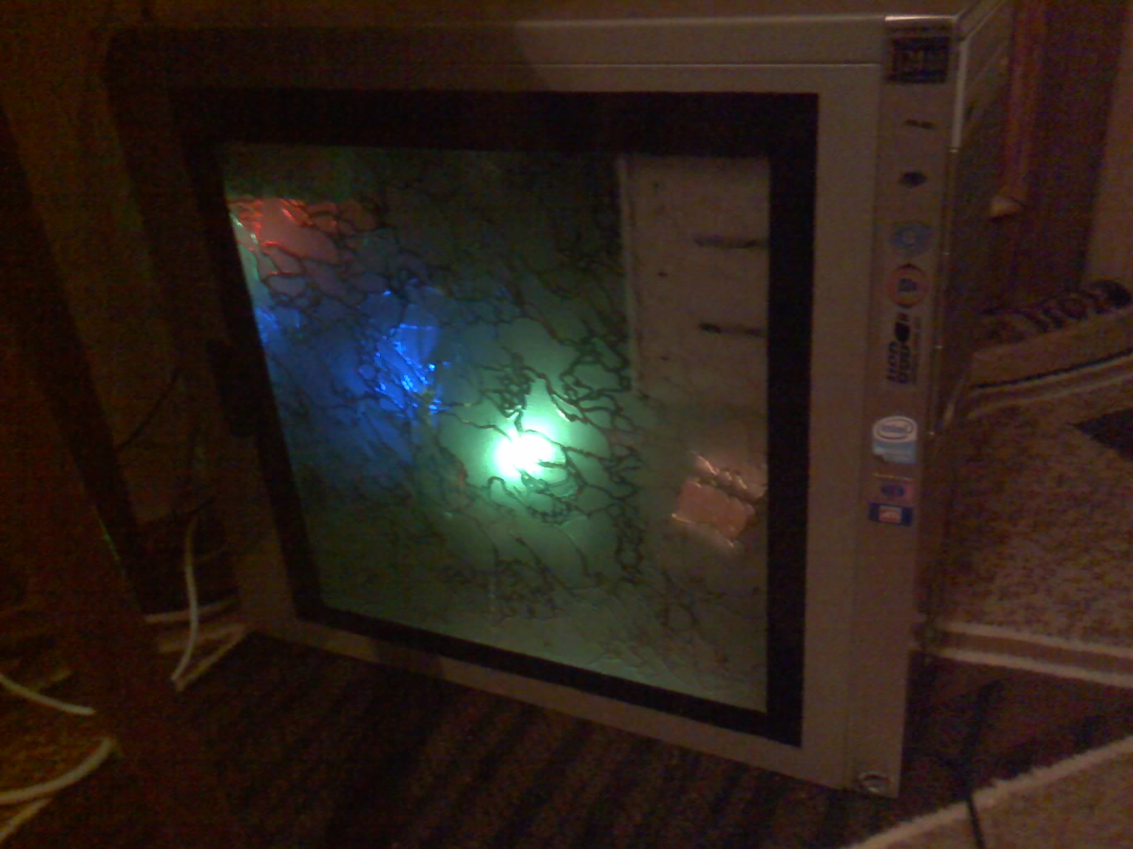 Короче фтопку светодиодную идею… Вся ставка была на стекло – оно должно было рассеивать по периметру свет (Типа мозаики). При попытке вырезать дырку для куллера стекло лопнуло. Опять стеклить было влом, прибил сетку (на заклёпки).
