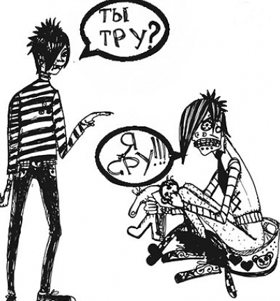 жила-была одна девочка, она была панкухой, нехвормалкой, а может и ваще гопихой (но это не так уж и важно). вопсчем нармальнай была. но однажды она увидила сра... странную компанию: маленькия они (разобрать половую принадлежность не представлялось возможным)) ф красифых черна-розофых тряпочках сидели в песочнице и плакали (а скозь рыдания доносились хрипы, типа "I hate myself and I want to die"). она решила их пажалеть и подошла к ним. спросила: