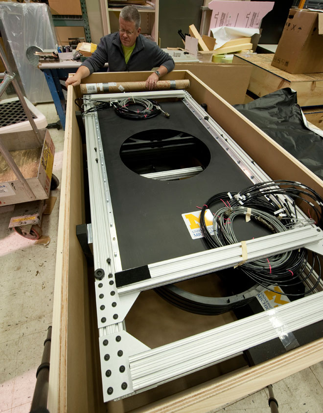 Там её сейчас тестируют, установив в крепление от телескопа (сборка крепления — на видео). А в полную силу камера заработает после установки на телескоп Виктора Бланко в горах Чили, в октябре 2012 года. Участники этого проекта собираются замерить скорость 300 млн галактик в Южном полушарии звёздного неба, чтобы проверить теорию о существовании тёмной материи. Проект Dark Energy Survey и эта 570-мегапиксельная камера уже обсуждались на Хабре, а сейчас предлагаем посмотреть фоторепортаж непосредственно с места строительства. Сборка камеры ведётся с 2008 года силами 120 астрономов, инженеров и физиков. Блок захвата изображения (imager) вмещает 74 отдельных сенсора совокупным разрешением 570 МП. На сегодняшний день в мире существует только одна камера с бóльшим разрешением: телескоп Pan-STARRS на 1400 МП, который ищет приближающиеся к Земле опасные астероиды. Но Dark Energy Camera не имеет себе равных по весу. Один только блок захвата изображения весит около 910 кг. Обоих «конкурентов» может с лёгкостью посрамить планируемый к строительству Large Synoptic Survey Telescope на 3200 МП, который тоже займётся поиском следов (эффектов) тёмной материи. Проблема только в том, что на его сооружение пока нет денег. На фотографии техник проверяет матрицу из 74 ПЗС-сенсоров. Двенадцать из этих сенсоров имеют меньшее разрешение (в сумме около 53 МП), они нужны для наведения и фокусировки телескопа. Остальные 62 сенсора (519 МП) непосредственно делают фотографии галактик. Все ПЗС сенсоры несерийные, а сделаны по спецзаказу в соответствии с необходимыми характеристиками — чтобы они были максимально чувствительны в инфракрасном диапазоне (в котором и предполагается снимать смещение удалённых галактик). Примерно такую картинку выдают все сенсоры вместе. Каждую ночь камера будет делать около 400 полноразмерных фотографий, каждая объёмом 1 ГБ. С подстанции в Чили их сразу будут отправлять для обработки и анализа в Национальный суперкомпьютерный центр в Иллинойсе (National Center for Supercomputer Applications in Illinois). Тяжеловесные детали камеры не будут висеть на самом телескопе. Для них инженеры соорудили отдельный 3,4-метровый «футляр». На фотографии внизу можно разглядеть блок с сенсорами (слева), основную оптическую систему фокусировки (справа) и две из шести пневмотрубок для наведения камеры. Телескоп Виктора Бланко расположен в одной из самых передовых обсерваторий южного полушария — Интерамериканской обсерватории Сьерро-Тололо в Чили. На схеме телескопа для масштаба изображены два человека (красный круг) и место установки Dark Energy Camera (зелёный круг). Детали самого тяжёлого в мире фотоаппарата внушают уважение. До соприкосновения с сенсорами свет проходит через четыре фильтра шириной 61 см. Они фильтруют диапазон проходящих волны, чтобы на сенсоры не попадало ничего лишнего. В инфракрасном диапазоне сенсоры будут делать, фактически, чёрно-белую картинку. Затем учёные-художники реалистично раскрасят её в разные цвета, используя научные методы (они специально рассчитывают, какой цвет логичнее всего подходит для волн определённой длины). На следующей фотографии показаны, пожалуй самые большие в мире и диафрагма и шторки затвора. Две стальные шторки спрятаны по периметру: они приходят в движение каждый раз, когда камера делает снимок. Двигаются шторки не слишком быстро, потому что для съёмки звёзд нужна длительная эксп