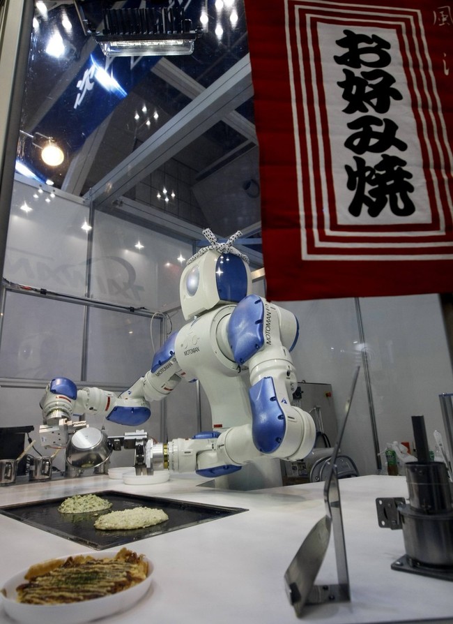 Робот Okonomiyaki Robot, робот-повар, умеет готовить одноименную традиционную японскую еду — пикантные блинчики. Робот понимает голосовые команды.