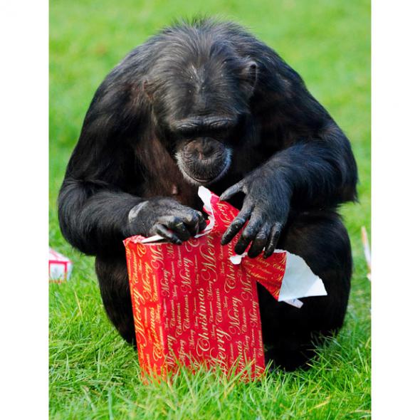 Шимпанзе открывает рождественский подарок в зоопарке «Twycross» графства Лестершир, Великобритания.