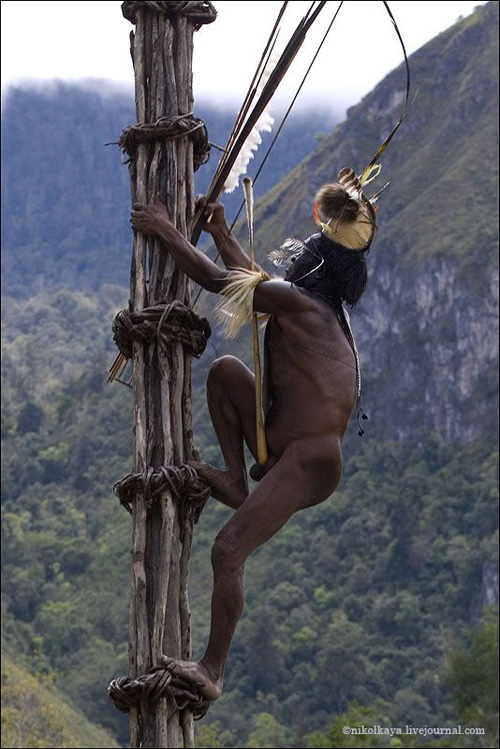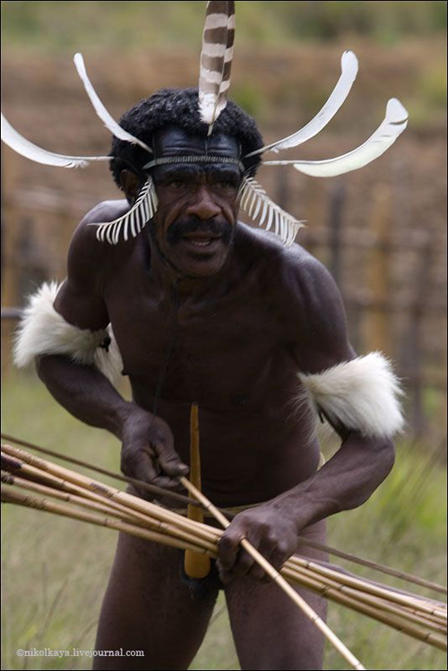 Племена Дани живут большими семьями общим двором по 30-50 человек. Женская половина вместе с кухней и свинарником, но отдельно от мужского дома, куда нас не пустили. Есть специальный дом для ночных свиданий супругов, по очереди. У Дани может быть несколько жен. Одна жена стоит 4-5 свиней. У главы семьи, где были мы (на фото) - 4 жены, 8 детей (4 сына, двое из них женаты и имеют по 2 жены). Свинья стоит очень дорого. Маленький поросенок - 100 долларов, большая свинья - до 3 тысяч. К примеру, огромная корова стоит всего 300 долларов.