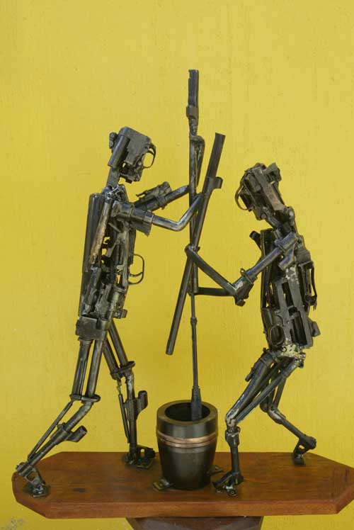 После того, как в 1998 году в Камбодже закончилась война, власти страны совместно с представителями Европы уничтожили 125 тысяч единиц стрелкового оружия. Проект PAPC спас тысячи из них, чтобы дать вторую жизнь. Название проекта Peace Art Project Cambodia (PAPC). Главная идея — "реликвии страшного прошлого, преобразованные в образы надежды на мирное будущее". Создали проект (в 2003 году) англичане — Нейл Вилфорд (Neil Wilford), специалист по стрелковому оружию, и художник Саша Констебль (Sasha Constable). К ним позднее подключились другие участники из Европы и США. Например, американец Марк Соломон (Mark Solomon), британцы Джой Раш (Joe Rush) и Тоби Пулман (Toby Poolman). Давайте посмотрим на эти произведения милитари-скульптуры. Последний раз редактировалось Solnyshko; 26.08.2007 в 21:42. |