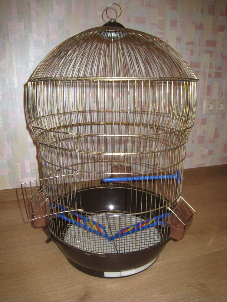 Металлическая клетка для содержания попугая средних размеров: h=63 см, d=40 см, две дверцы, съёмный поддон для удобства уборки, три кормушки, возможность подвесного расположения клетки. В клетке жил попугай корелла. Состояние: имеются потёртости, снята пружина удержания 1 дверцы, не на что не влияющая едва заметная трещина поддона. Причина продажи - приобретение новой клетки.