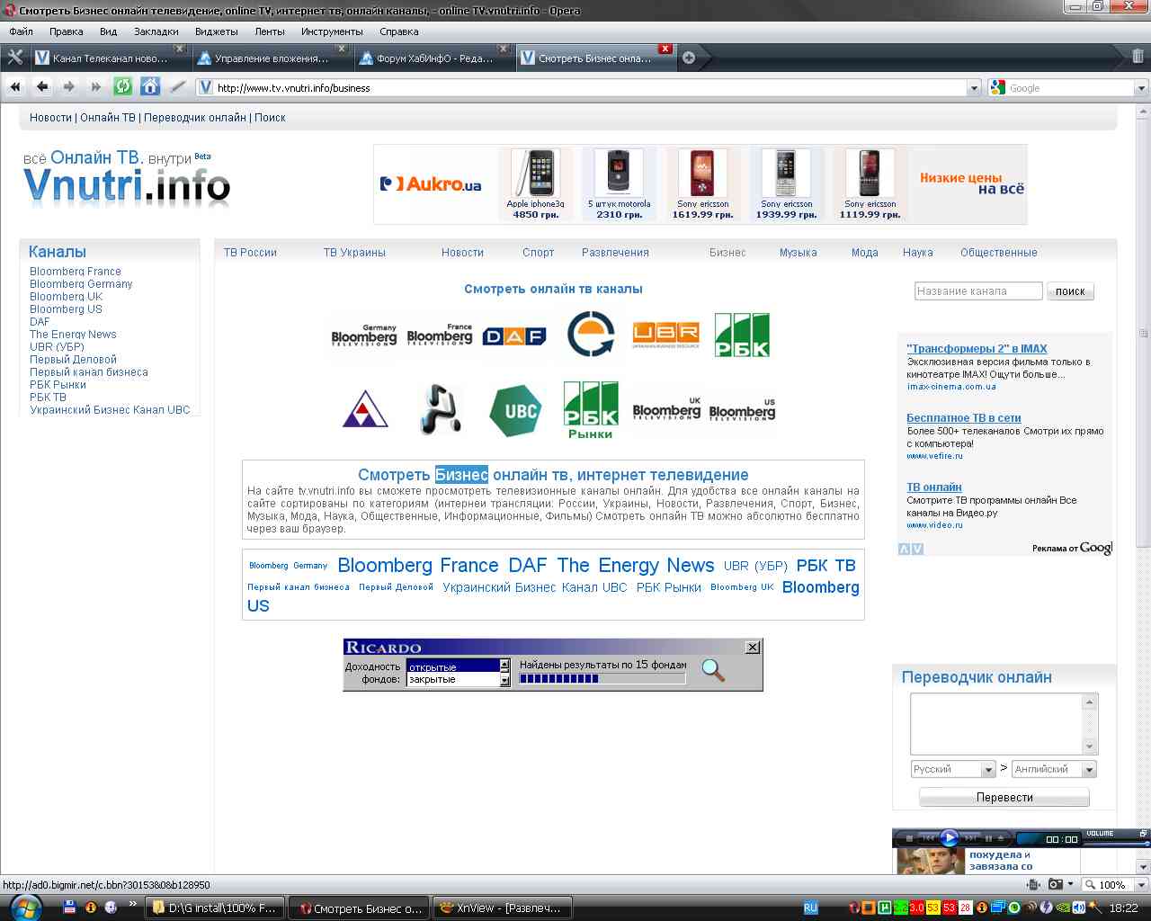 На сайте tv.vnutri.info вы сможете просмотреть телевизионные каналы онлайн. Для удобства все онлайн каналы на сайте сортированы по категориям (интернет трансляции: России, Украины, Новости, Развлечения, Спорт, Бизнес, Музыка, Мода, Наука, Общественные, Информационные, Фильмы) Смотреть онлайн ТВ можно абсолютно бесплатно через ваш браузер.