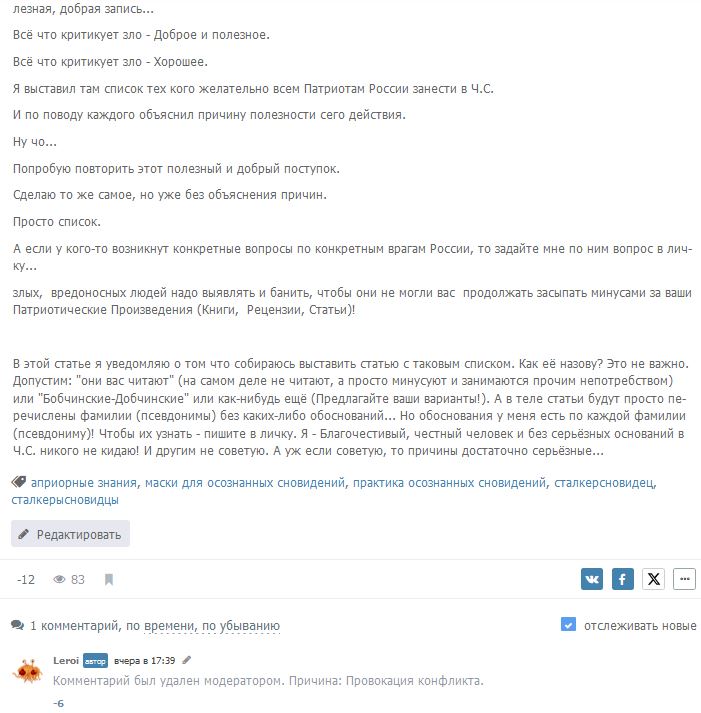 По умолчанию сносят без причины его книги, рецензии и статьи