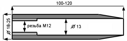 На рисунке приведено изображение составного надульника на ИЖ-60 (длина 92 мм, максимальный диаметр 22 мм, масса ~130-150 г), изготовленного из 2-х трубок и завороненного указанным выше способом. Материалы - обрезок полудюймовой водопроводной трубы и другой, меньшего диаметра, из подобной стали, соединенные нагорячо “труба в трубе” для жесткости посадки. Время изготовления – около 30 минут, инструменты – ножовка, молоток, плоскогубцы, дрель, сверло 3 мм и метчик М4 (отверстие с резьбой под шпильку), газовая плита.