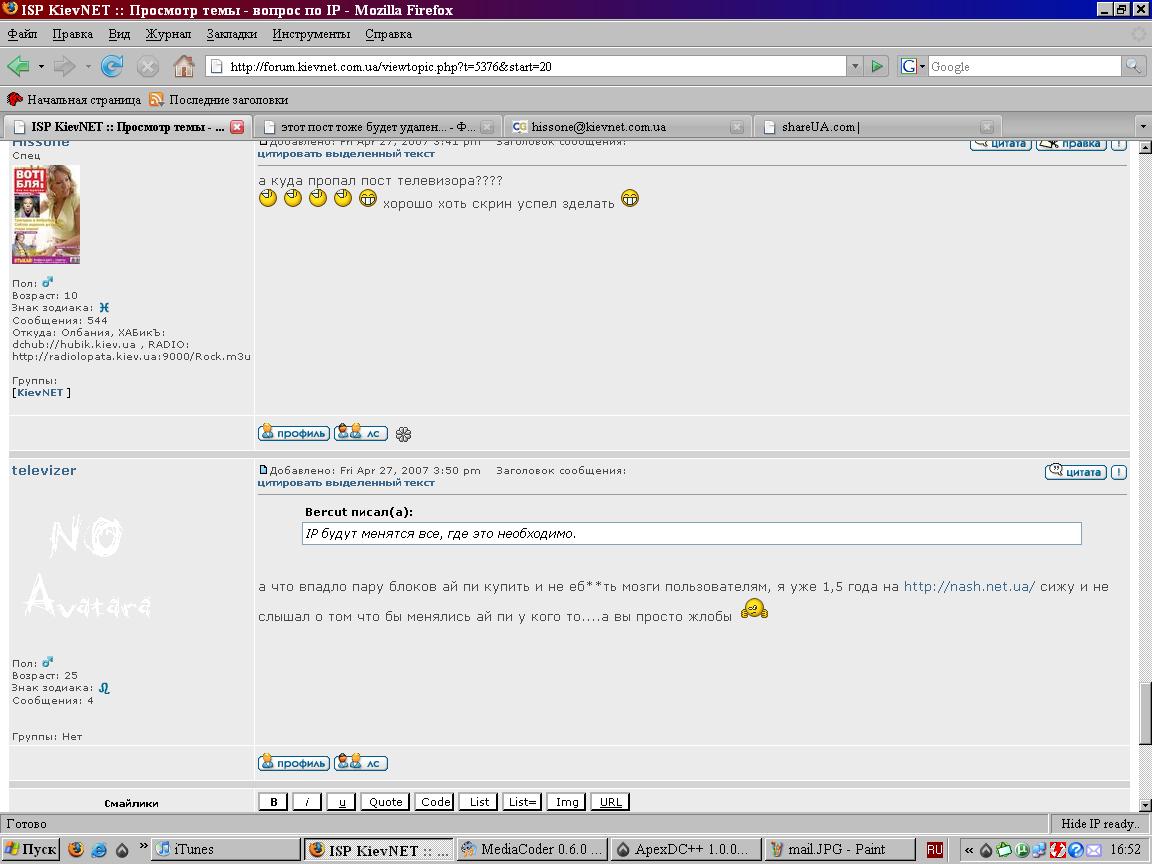 я думаю этот пост будет удален с киевнетовского форума мля... https://forum.kievnet.com.ua/viewtop...?p=58646#58646 если ссылка не работает то гаплык на картинке ниже содержание поста... Последний раз редактировалось Hiss; 27.04.2007 в 17:54. |