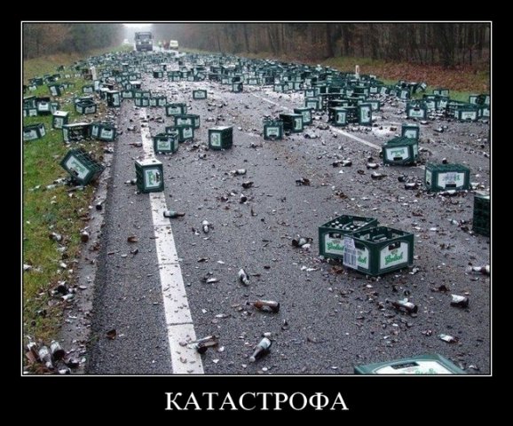 а я видел такую аварию - в день рождения Стрема под Черкассами. Там перевернулась фура с пивом и лежала поперек трассы... пробка была в обе стороны километровая.. а я торопился в "Славутич"... пошел туда посмотреть - подхожу - Мать честная! - трупы.. трупы.. вдоль обочины... пригляделся - странные какие-то.. все в желтых накидочках лежат... оказалась - это бригада ремонтников, которую прислали растаскивать завал - все в сиську пьяные спят.. много целых бутылок было видать вначале.. я-то ни одной не увидел уже...
